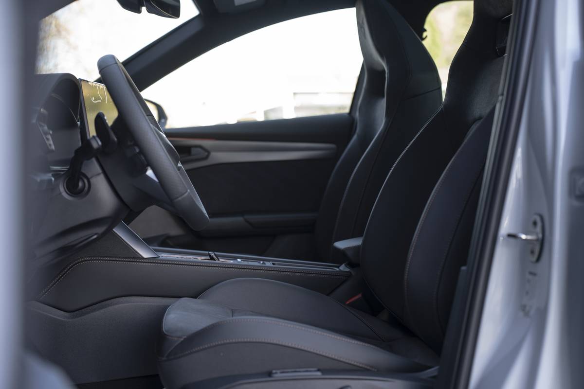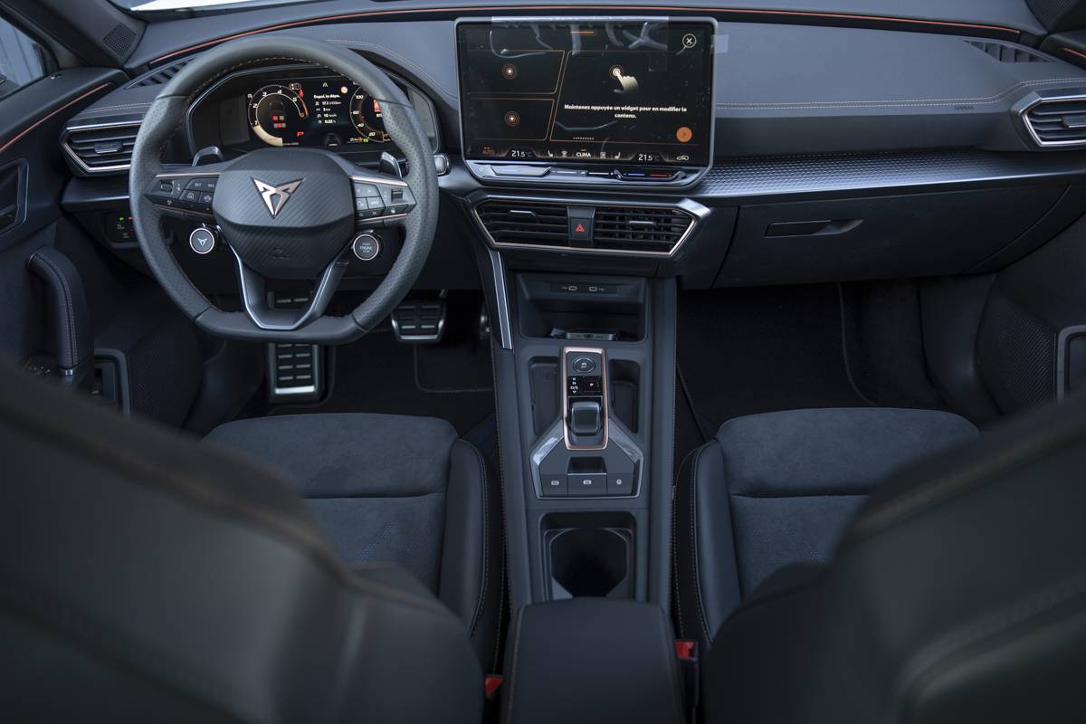 Design intérieur Dynamic – Sièges baquets suédine Noir Asphalte avec poinçonnage Bleu Astral et surpiqûres cuivrées – Logos CUPRA estampés sur les appuie-têtes – Planche de bord noire surpiquée avec inserts Dark Alu – Contre-portes suédine noire avec poinçonnage Bleu Astral – Siège conducteur : chauffant avec réglage électrique à mémoire, y compris réglage lombaire – Siège passager : chauffant avec réglage manuel de la hauteur