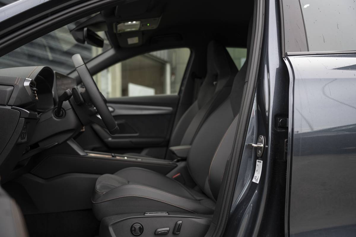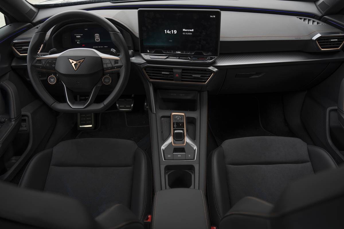 Design intérieur Dynamic – Sièges baquets suédine Noir Asphalte avec poinçonnage Bleu Astral et surpiqûres cuivrées – Logos CUPRA estampés sur les appuie-têtes – Planche de bord noire surpiquée avec inserts Dark Alu – Contre-portes suédine noire avec poinçonnage Bleu Astral – Siège conducteur : chauffant avec réglage électrique à mémoire, y compris réglage lombaire – Siège passager : chauffant avec réglage manuel de la hauteur